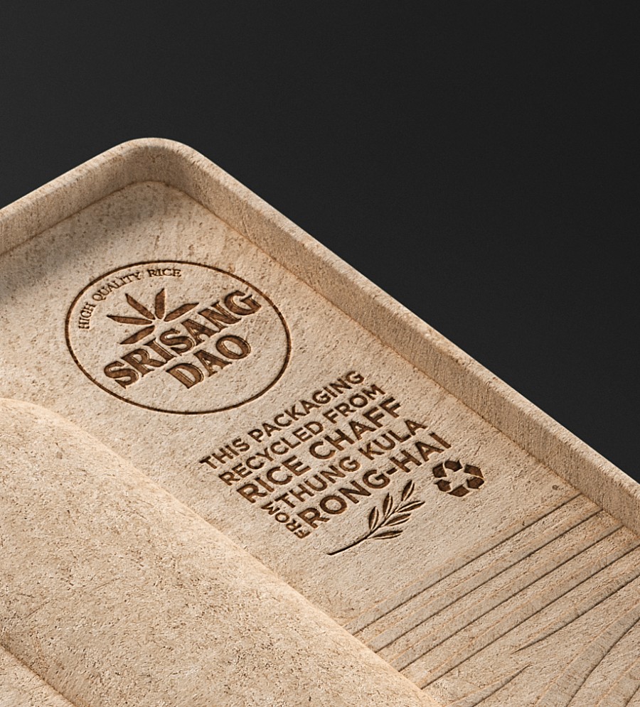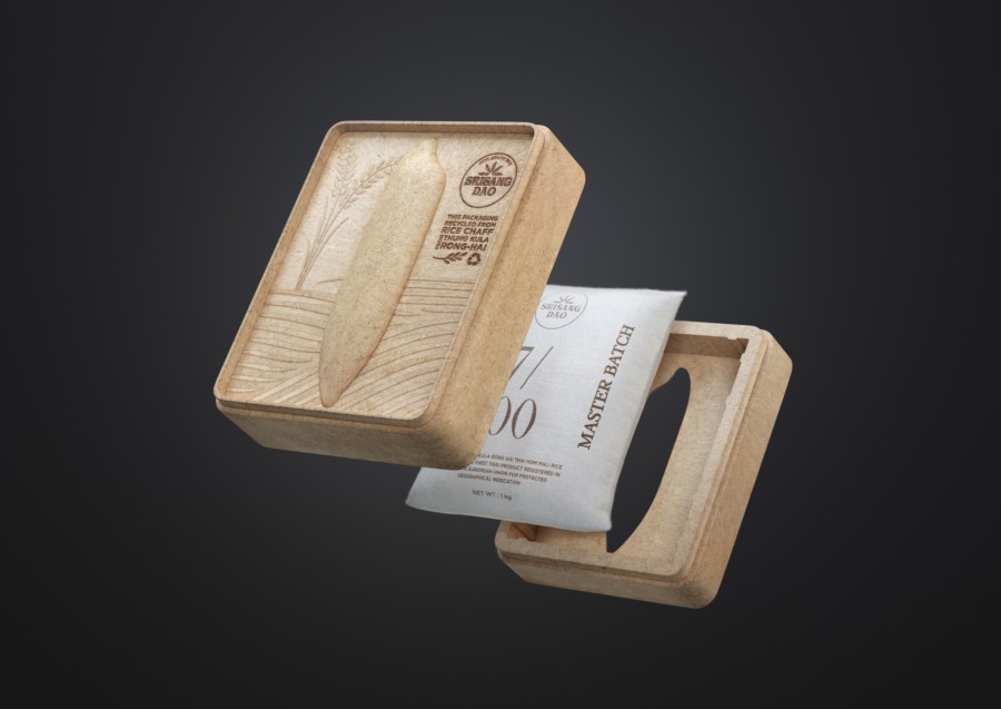 Thung Kula Ronghai是泰國著名的稻米產區,其優質的稻米生產享譽世界。在受控的環境中,每年的大米產量有限。因此,這種有機大米保證了最好的質量和不含化學物質。大米包裝設計面臨的挑戰是如何體現有機水稻的生長過程。Prompt Design設計的包裝袋使用的是來自于稻米去殼過程的廢棄物——糠皮。包裝模壓成型,盒蓋頂部為稻形壓花,盒子里裝著米袋。此外,這個大米包裝盒使用后可以用作紙巾盒。真正體現了環保的初衷。